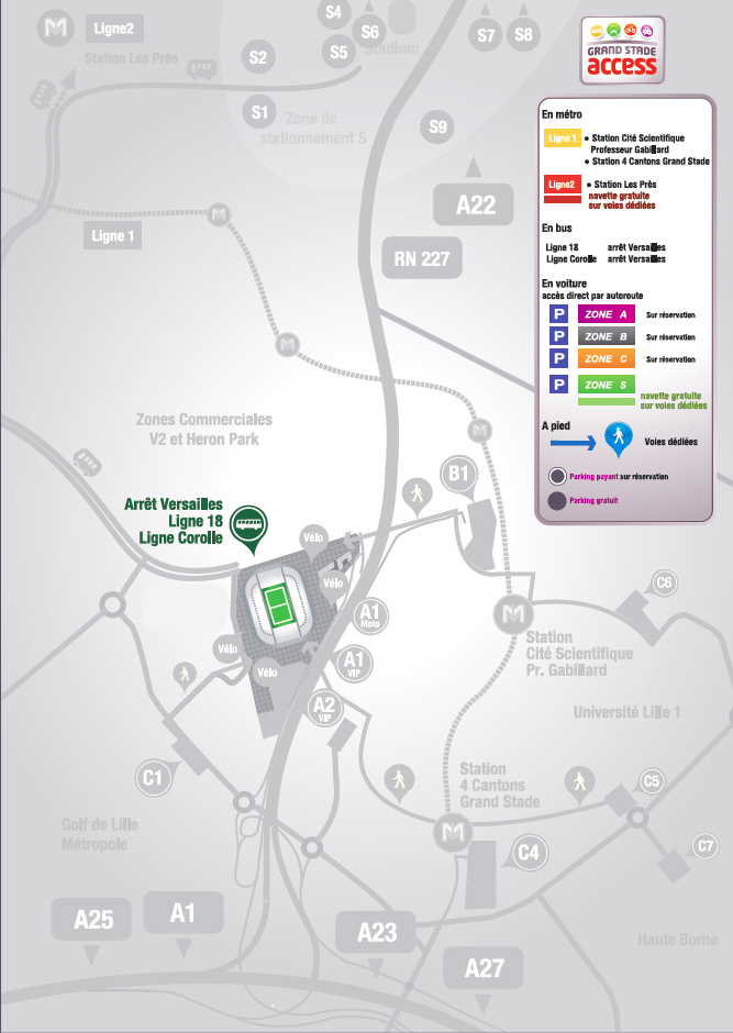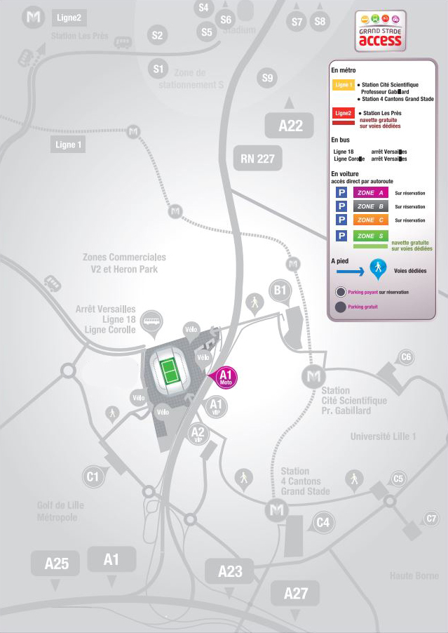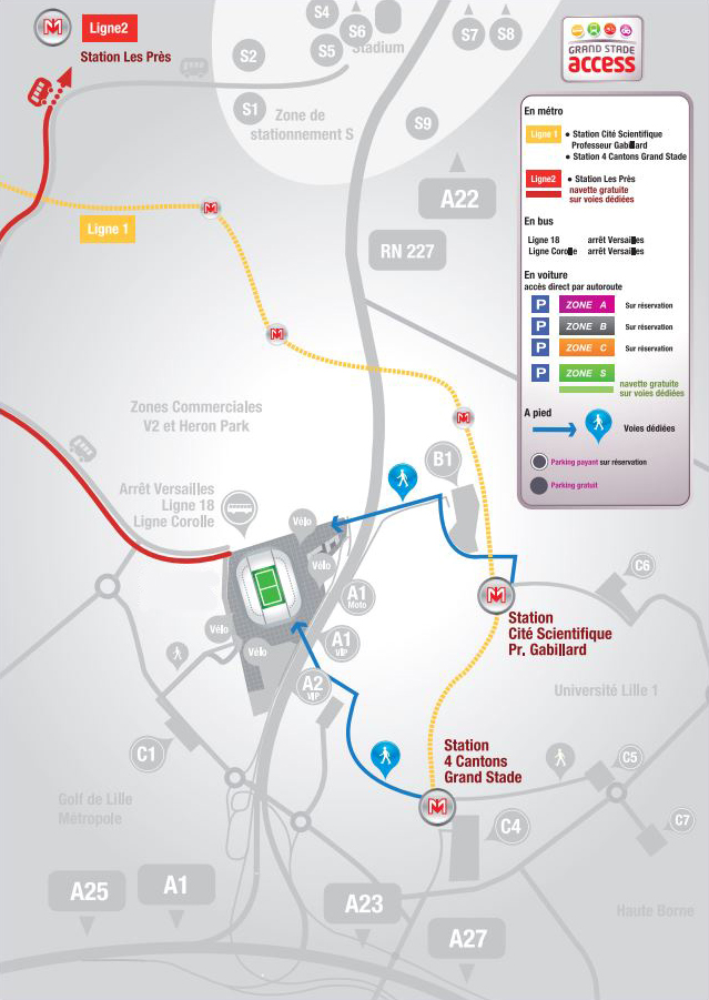 Le Stade est situé à l’intersection de plusieurs autoroutes, vous permettant ainsi de vous y rendre facilement. Quelle que soit votre provenance, suivez les indications « Grand Stade » ou « Stade Pierre-Mauroy ».