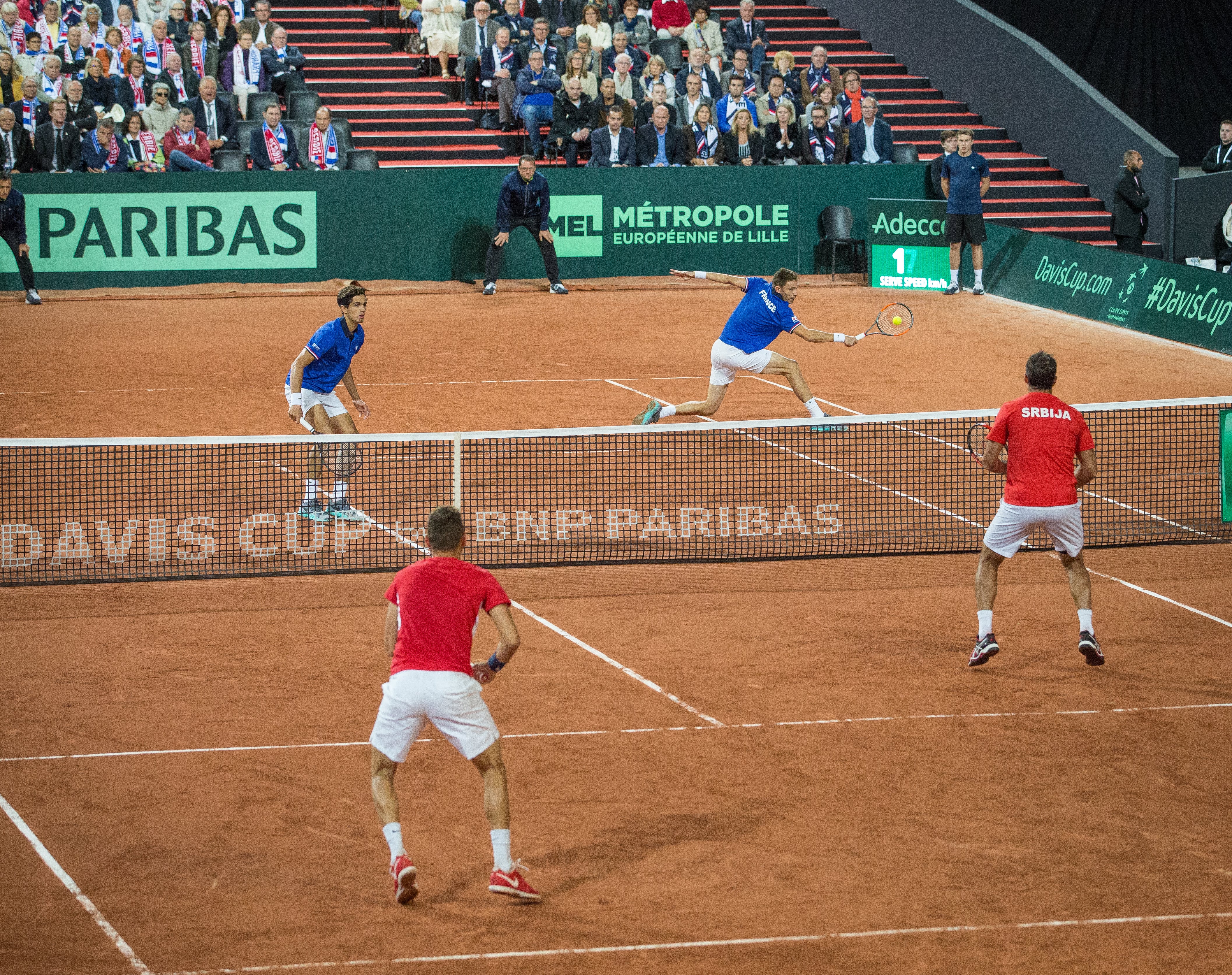 Place au double composé de Pierre-Hugues Herbert et Nicolas Mahut, côté français et de Nenad Zimonjic et Filip Krajinovic, côté serbe ! Le duo français a remporté son double en trois sets (6-1, 6-2 , 7-6) malgré un troisième set plus accroché en moins de deux heures de jeu.